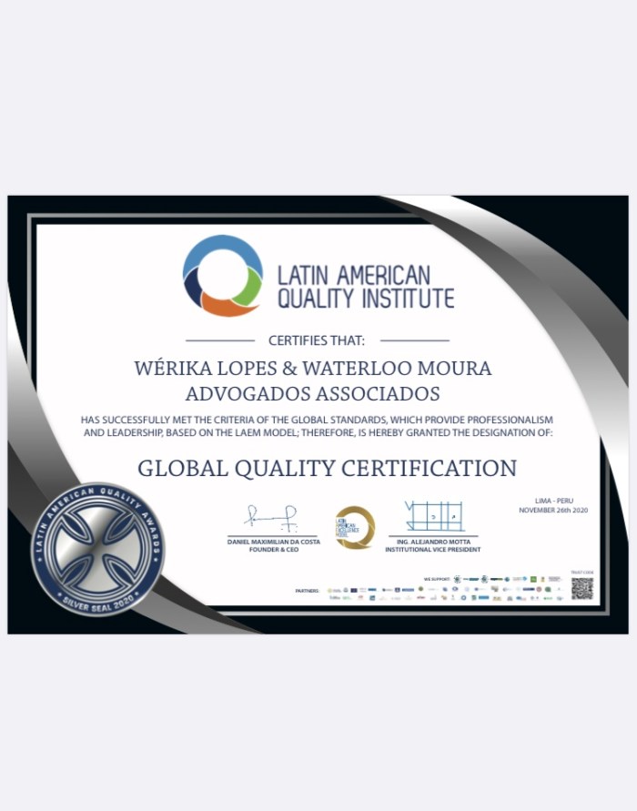 Nosso escritório foi agraciado com o Global Quality Certification, e recebeu o selo Silver Seal 2020 – LATIN AMERICAN QUALITY AWARDS do renomado LATIN AMERICAN QUALITY INSTITUTE